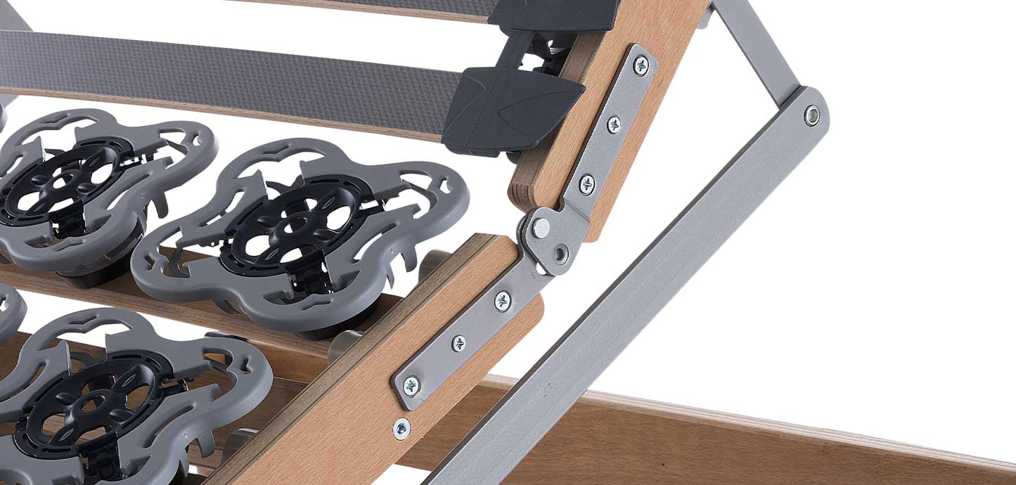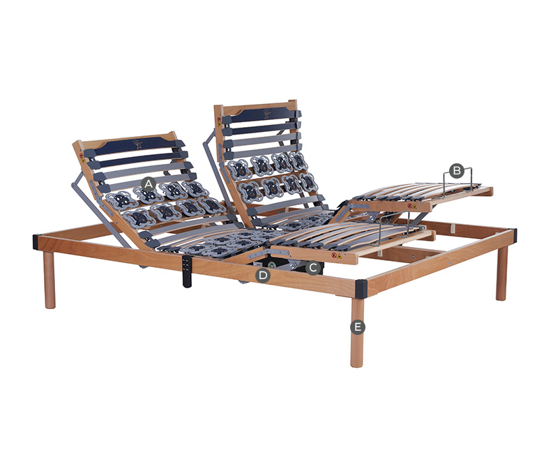 The ergonomic plates with shock absorbers in the dorsal and lumbar area allow you to adjust the firmness of the adjustable base to suit your individual needs based on your body weight. The adjustable base also has 26 beech staves with rubber shock absorbers to ensure optimum support of the body. Thanks to the double joints and the handy remote control, you can independently adjust the height (and therefore type of comfort) of the head, shoulders, torso and legs. The bed base in double version can be ordered as a single support surface or as two separate bases to be placed side by side.