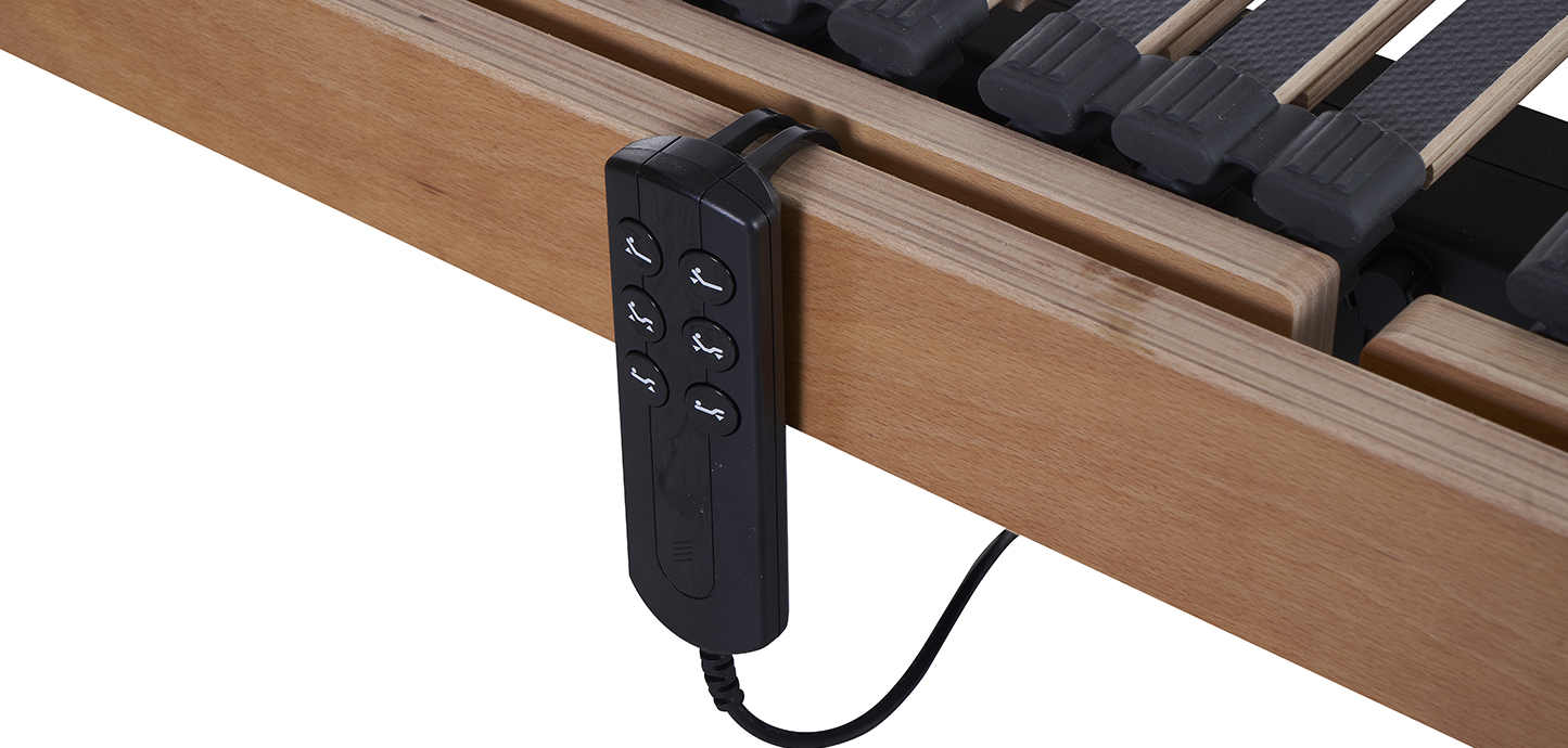 Made from multi-layered beech slats with shock absorbers, the bed base offers optimal support for the body. The rigidity adjusters allow for customisation of the bed base to suit individual preferences, ensuring a refreshing and restorative rest. With double joints and a remote control, the comfort of the head, shoulders, torso, and legs can be adjusted independently.