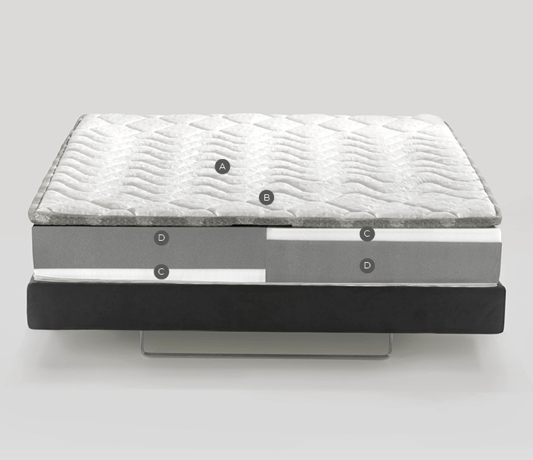 Memoform® is the most anatomical of the materials used, and is designed to react to the weight of the body and to adapt perfectly to each silhouette. This property offers a pleasant feeling of ease and lightness during rest, and benefits the relaxation of the spine