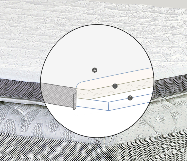 The fabric cover is removable and made of anti-bacterial treated Viscose*, a silky material with excellent thermal properties that ensures maximum hygiene. The 3D strip around the topper allows increased breathability.