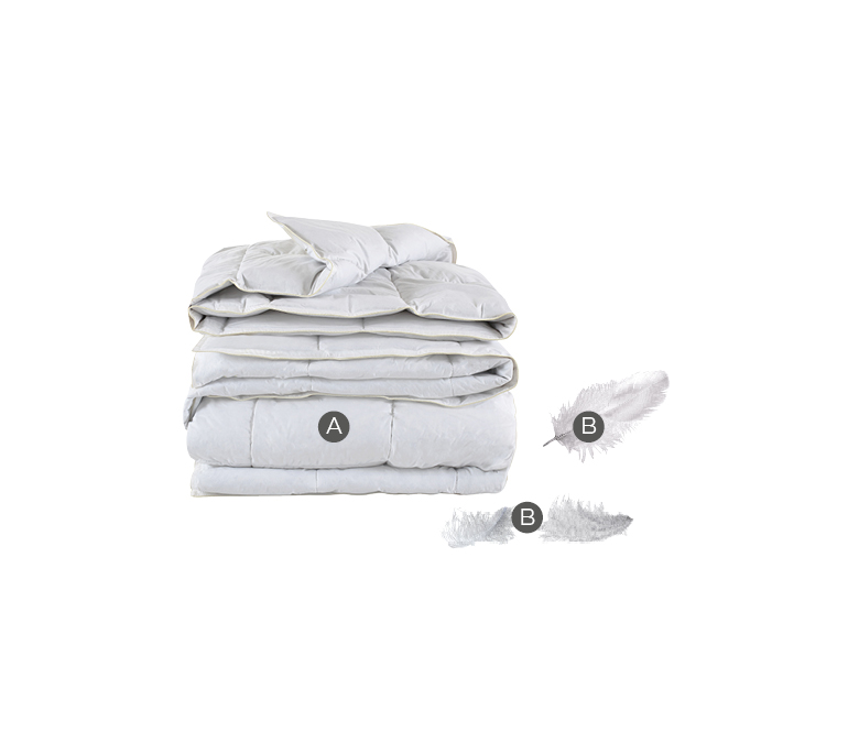 L’interno è realizzato in piuma per il 20% e in piumino per l’80%. La piuma ha la capacità di mantenere inalterato il microclima del corpo, trattenendo una grande quantità d'aria al suo interno. Il piumino è più piccolo e morbido della piuma, ed offre il massimo della leggerezza e del volume per un comfort extra soffice. Questa unione consente di dissipare l’umidità, evitando sbalzi termici durante tutta la notte.