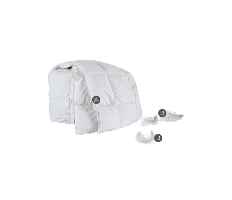 L’interno è realizzato in piumette per il 5% e in piumino per il 95%. Le piumette hanno la capacità di mantenere inalterato il microclima del corpo, trattenendo una grande quantità d'aria al loro interno. Il piumino è più piccolo, pregiato e soffice, ed offre il massimo della leggerezza e del volume per un comfort extra soffice. Questa unione consente di dissipare l’umidità, evitando sbalzi termici durante tutta la notte.