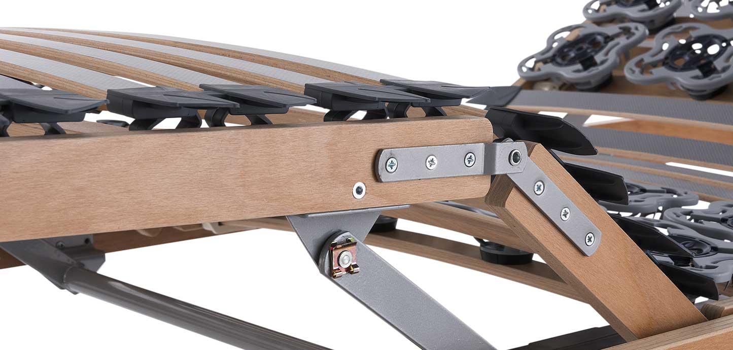 La rete è composta da 26 doghe in legno di faggio, dotate di ammortizzatori in caucciù e regolatori di rigidità che donano un sostegno personalizzabile a tutto il corpo, per un comfort perfetto che dura tutta la notte. Grazie ai doppi snodi e al pratico telecomando si può regolare in modo indipendente il comfort della testa, spalle, busto e delle gambe.